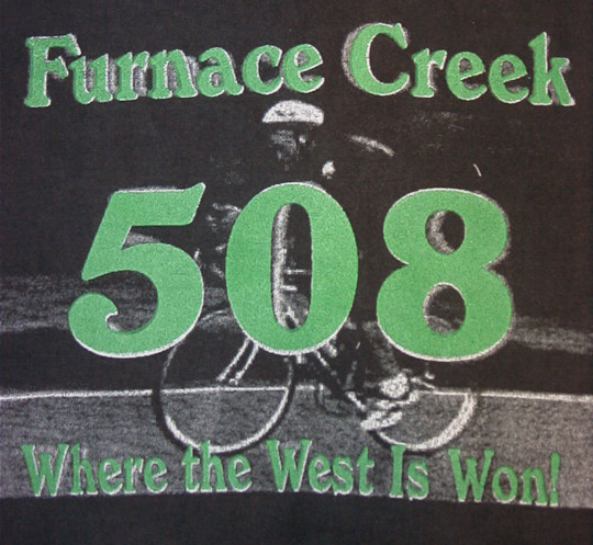 Chris Kostman's 508/RAAM Quilt, made by Shelby Kostman1998: We launched our website, www.the508.com, in 1998 and this was what its original front page looked like. Nick Gerlich, a 508 and RAAM veteran, designed that original website and also did this t-shirt for us. Thanks, Nick! That's course record holder Rainer King Crab Klaus in a photo by Dave Nelson, the RAAM/508 photog that I first met back in 1984 at the JMO. |