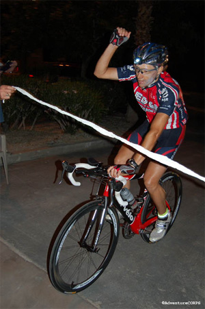 I decide I have one hour left in my legs and that is it! I either get there in one hour or I DNF. I drop into TT mode and mash the pedals as hard as I have ever ridden. My legs are screaming and I'm screaming back at them—out loud! I'm really losing it now! I'm not sure how, but I smoke those final miles. I pass three other riders and crew. They must have laughed as we went by and I'm yelling out loud—for what seemed like no particular reason.